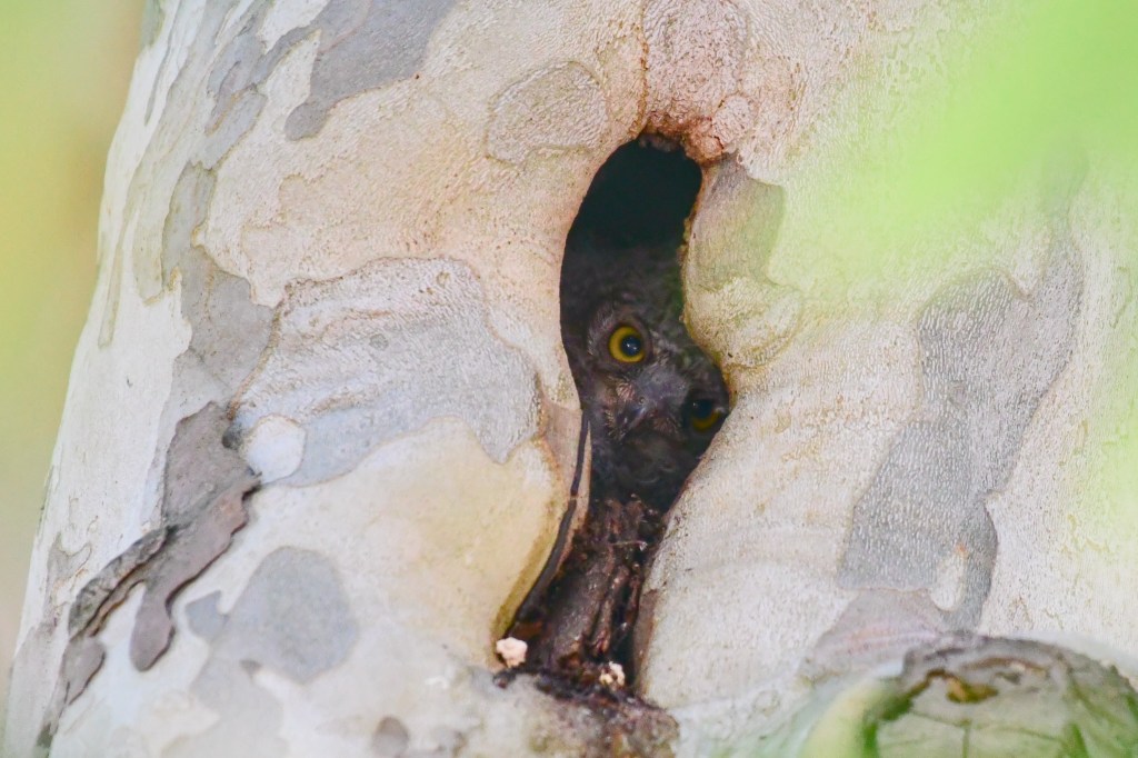 这窝红角鸮的巢穴位于中山公园南门门口的一棵法国梧桐树上。