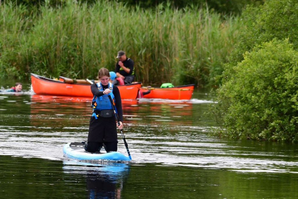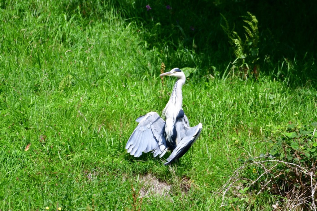 河水清澈见底,缓缓注入大湖。有人穿着防水衣,划着充气小艇溯流而上。在河边的草地上,一只年轻的苍鹭百无聊赖地摊开翅膀,是不是在等待亲鸟带回食物。两只乌鸫在草坪上晒着太阳,一会又去水洼里洗澡。一只Garden Warbler躲在灌木丛中不肯露面。