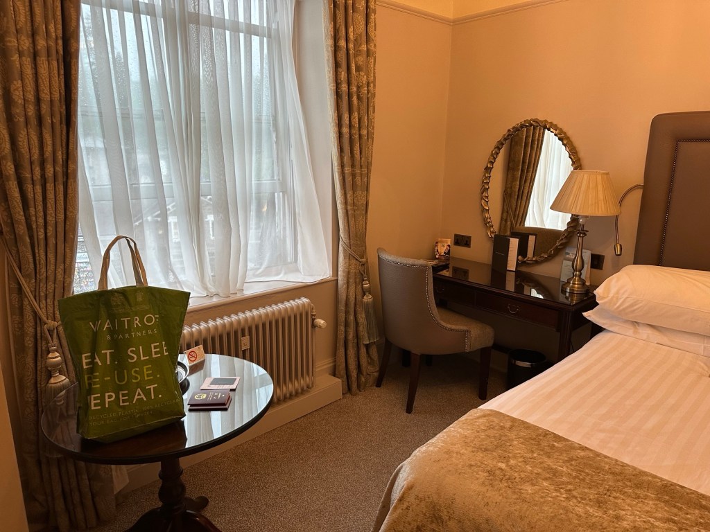 吃过晚餐,我们回到酒店。这是一幢老式的酒店。此时一辆旅游巴士正停在门口,一群日本的老年旅行团正在办理入住。我们登上酒店的老式电梯,电梯小小的,只能坐四个人。房间里有一张柔软的双人床(英国人对柔软的床垫有特别的热爱),窗户是临街的,看得到湖边的码头,木制窗户老得已经无法正常开闭,只能在内侧新安装一层铝合金的窗户。