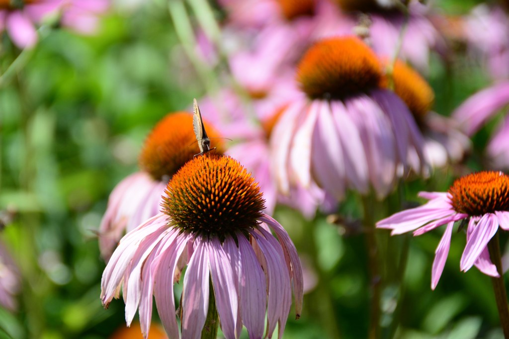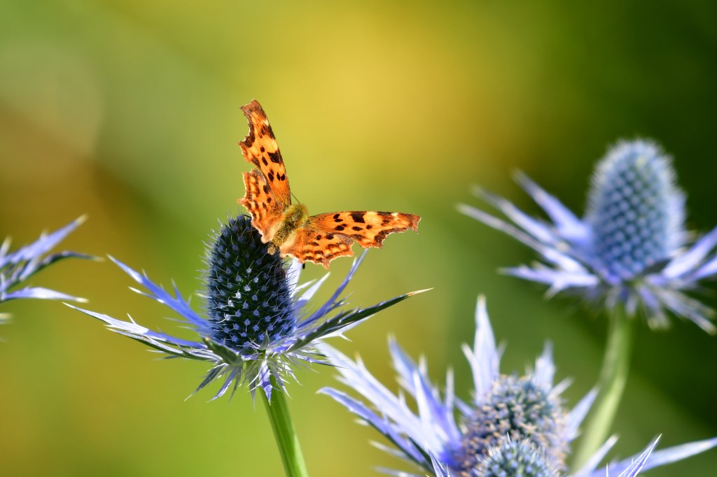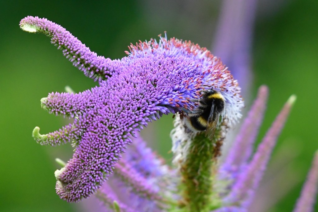 我们去探索北面的一个花园。各色花朵在夏日的阳光下纷纷绽放,蝴蝶和蜜蜂在花丛中忙个不停。白钩蛱蝶和菜粉蝶偏爱黄色的蒂立菊和松球样的扁叶刺芹,西方蜜蜂在荷包豆红白相间的花朵上忙碌,欧洲熊蜂则看好了紫色、长相奇特的兔儿尾苗。欧洲熊蜂和西方蜜蜂相比,属于一种野生的蜜蜂,体型较大,体色偏黑,绒毛密集,比较耐寒。用我们的话来说,就是长得比较丑。