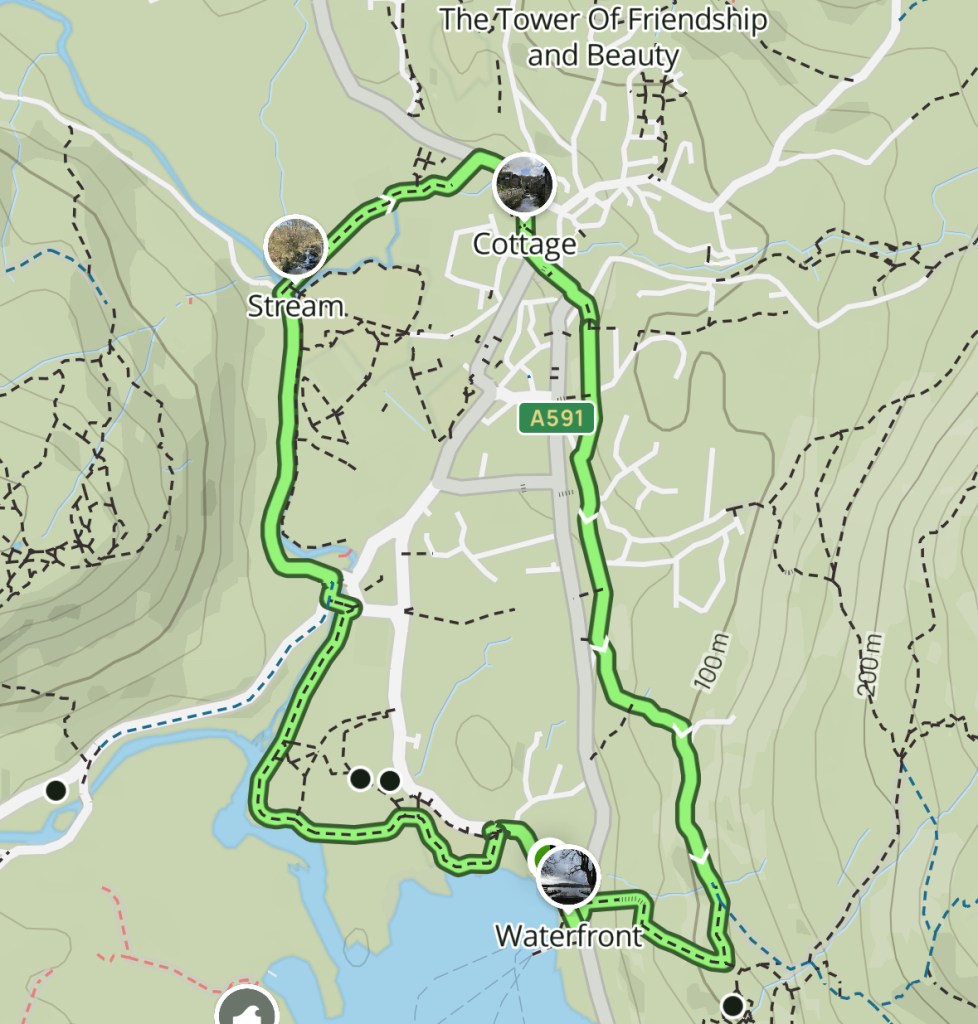 出发之前,我找到一条徒步路线,从登岸的Waterhead开始,先是向西沿着Rothay河溯流而上,然后再向东在镇子东面的山林中漫步,在Ambleside镇转上一个圆圈,回到Waterhead。这条路线大约5.1公里,预计时间1小时17分钟。