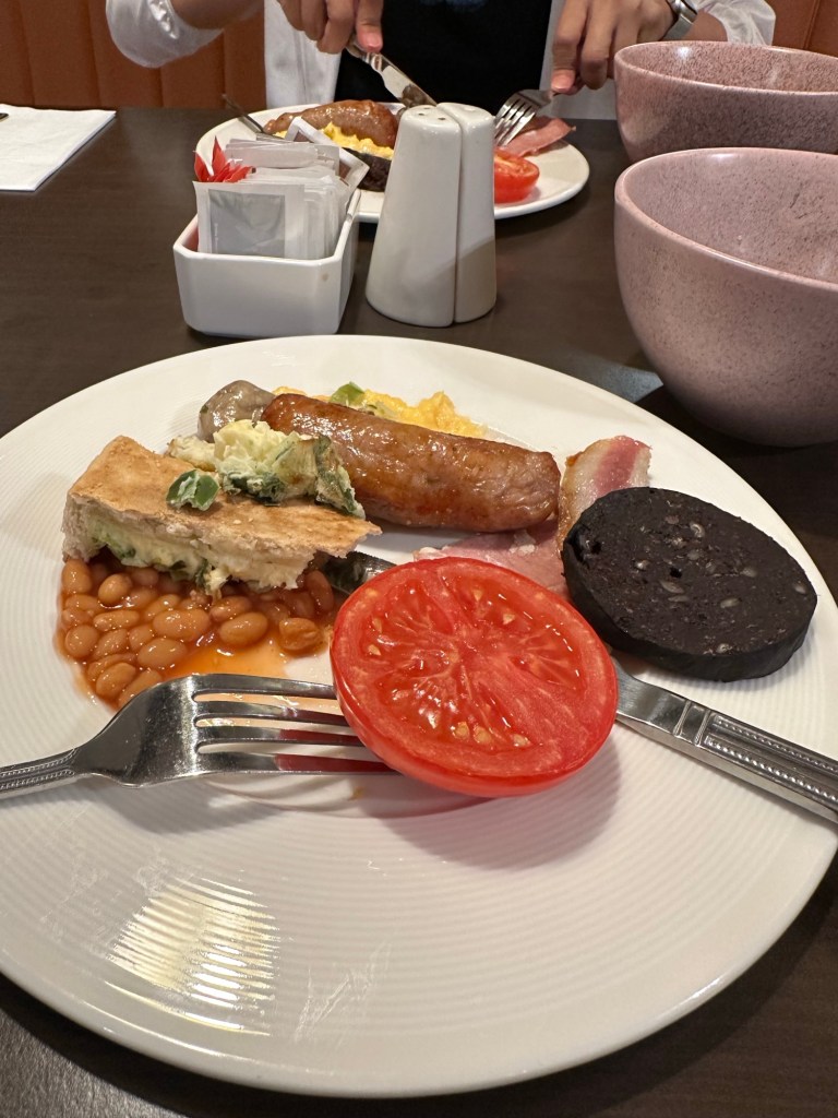 早晨7点半,我们坐在酒店的餐厅,吃昨天没有吃到的全英式早餐。