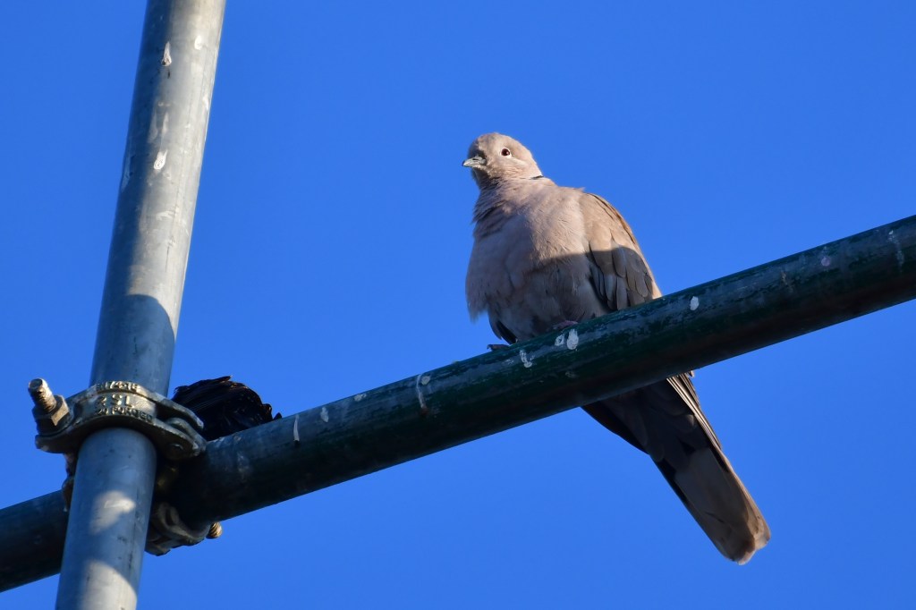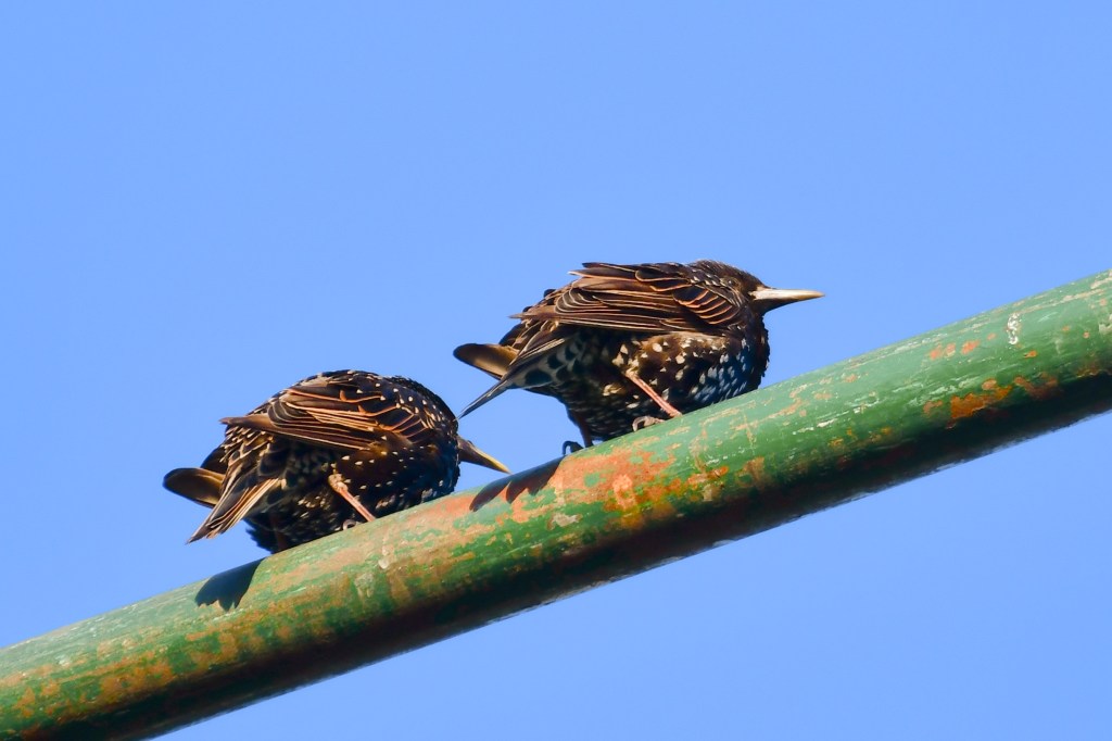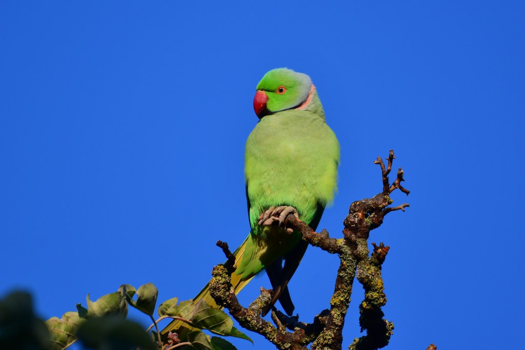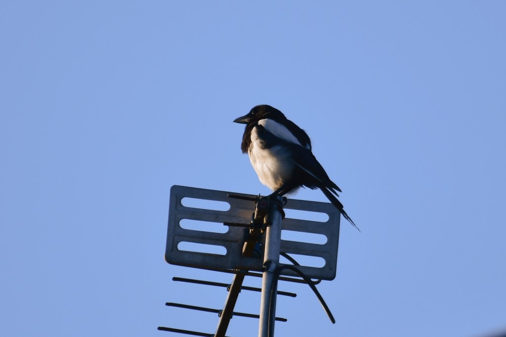 鸟儿总是早起的。灰斑鸠站在脚手架上,几只乌鸦在屋顶吵吵闹闹,喜鹊占据了屋顶的电视天线,几只刚刚出巢不久的紫翅椋鸟在冷空气中缩着脖子,青山雀在苹果树上蹦蹦跳跳,忙着捉虫。天空中雨燕在飞来飞去。一只红领绿鹦鹉大叫着飞来,停在树顶,好奇地看着我们。