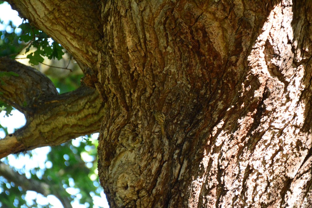 在粗大的树干上,我们发现了旋木雀。他的体色与树干极为相似,有着特殊觅食习惯,他们会沿着树干自下而上呈螺旋状攀缘,用细长且略向下弯曲的嘴,不放过每一个角落仔细寻找树皮中的昆虫,一旦爬至树梢,则俯冲到另一新树的底部继续攀爬。