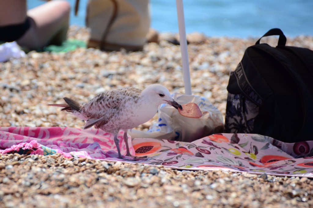 我们在海滩上看到惊人的一幕。我们前方不远处,一对游客正在用午餐,他们手持的三明治显然引起一些机会主义者的注意。几只成年的银鸥一直有高处盘旋,此时,其中的一只显然找到了机会,他突然从高空俯冲下来,悄无声息地从后方逼近,从游客的肩头一冲而过,一口夺走游客手中的三明治。