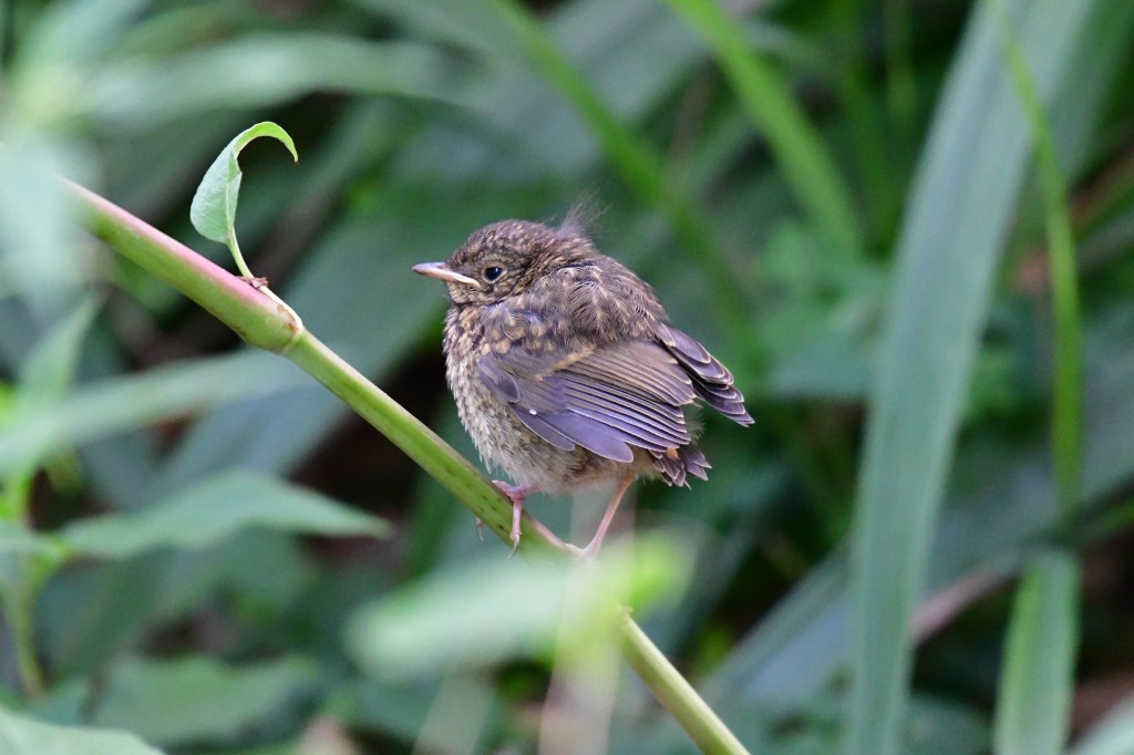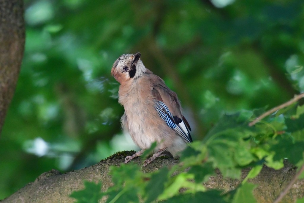 松鸦(Jay)的长相比较有趣。这是一种鸦科的中型鸟类,下嘴基部有一卵圆形黑斑,向后延伸至颈侧,从正面看,嘴角两边的黑色斑纹如同 “八字胡” 或 “两撇小胡子”。我们见到一只幼鸟,羽毛还是乱蓬蓬的,也不像成鸟一般小心翼翼,我们走近也并不飞走。