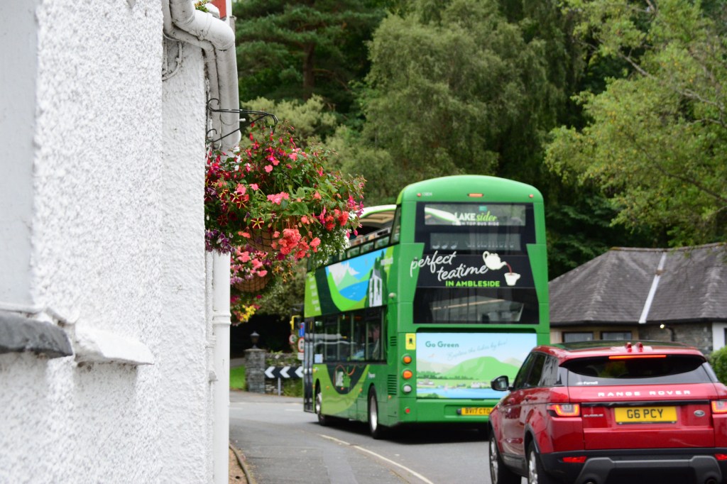 我们坐上555路公交车,去更远处的Grasmere镇。登上双层巴士的第二层,二层是敞开的。右边是碧绿的山坡,左侧不远处就是美丽的Grasmere湖。