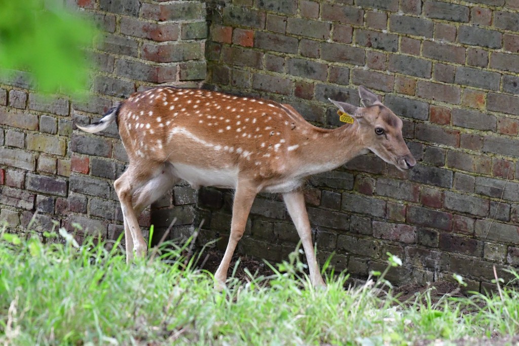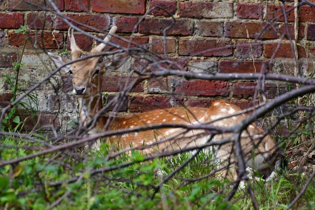 我们从一条刚刚发现的小径走向公园的另一个出口,快要到达出口的时候,意外的发现了四只野鹿。这是四只黇鹿,有些像梅花鹿,身上有白色的斑点,其中两只还有耳标。