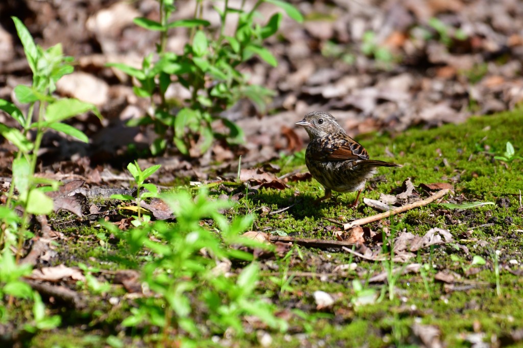 渐渐的,我们分辨出他们的身影。一只大斑啄木鸟从树上跳到喂食器,啄食着里面的脂肪球。几只林岩鹨在树桩上蹦蹦跳跳,寻找从喂食器掉落的食物。乌鸫在铁栅栏附近的落叶中翻来捉去。一只欧亚鸲一会跳到草地中央的小径上,一会跳到矮矮的小树桩上,一会躲进光线晦暗的灌木丛边沿,橙色的面部和前胸在早晨的阳光中格外耀眼。平时难得一见的戴菊,也从茂密的树叶从中露出小巧玲珑的身躯来,金黄的顶冠熠熠发光。