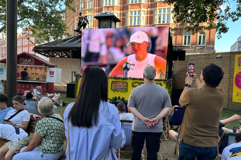 我们到泰晤士河上的Jubilee桥看了一会风景,来到莱斯特广场。这是一片绿地,有一片大屏幕,正在播放BBC直播的女子单打半决赛。我们刚刚到达的时候,5届大满贯冠军波兰选手施瓦泰克正打出最后一击,以6:2,6:0强势淘汰瑞士选手本西奇,首次进行温布尔顿的决赛。在后来举行的决赛中,施瓦泰克又再进一步,击败美国选手安妮西莫娃,夺得职业生涯第6座大满贯奖杯。