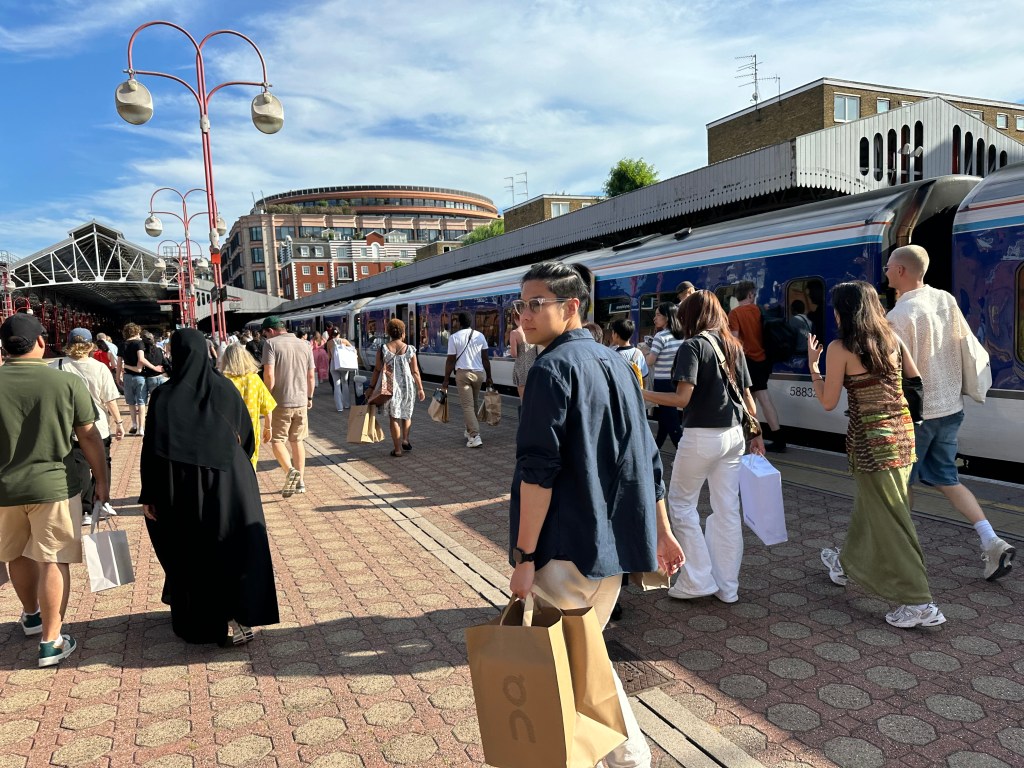 火车带着游客们回到伦敦,许多游客提着大包小包。兴高采烈地结束一天的购物之旅。